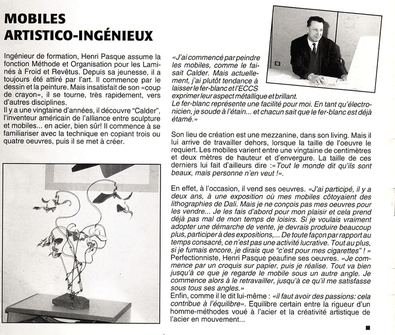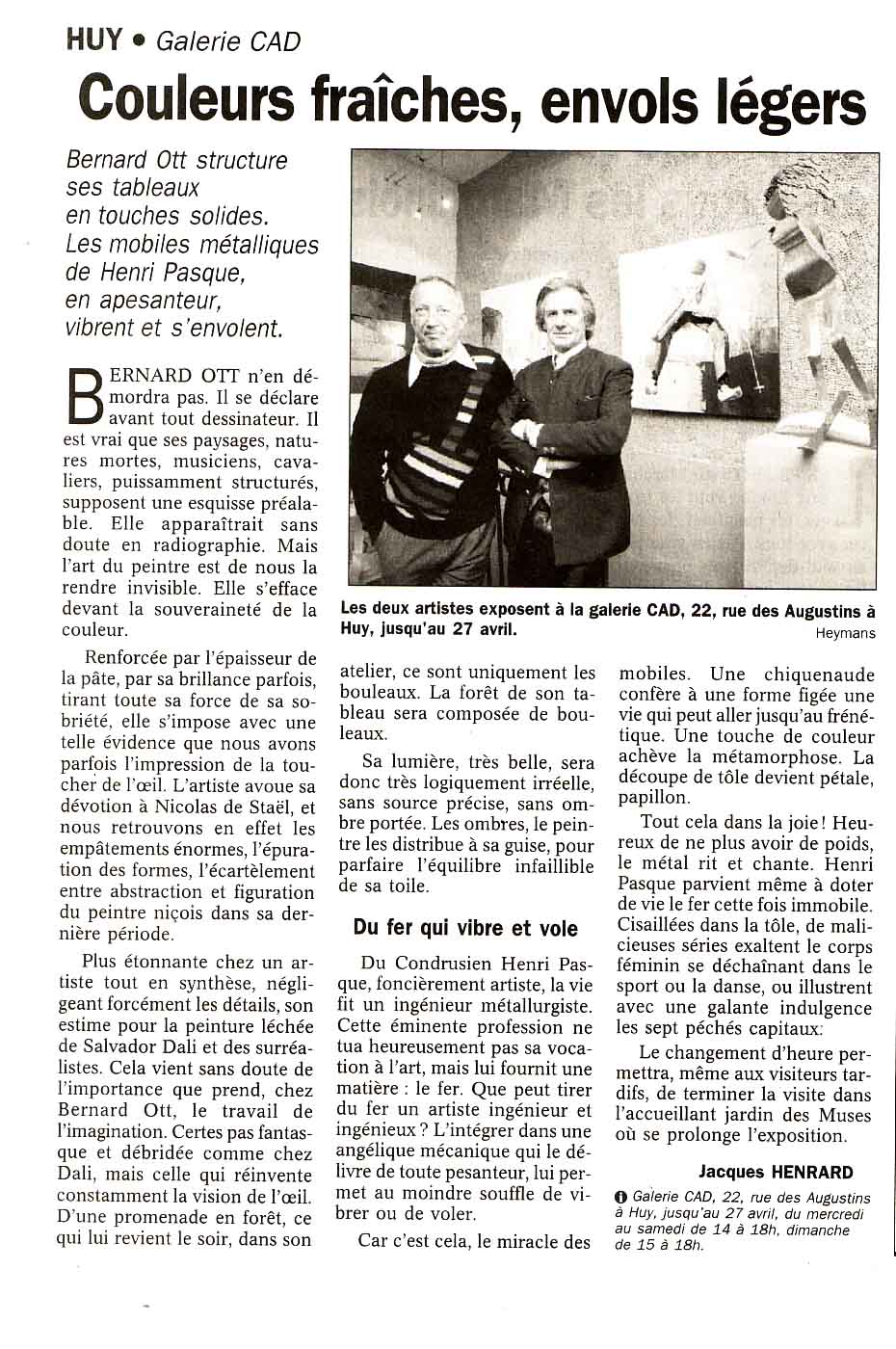 | Après une première exposition en 1993 quelques années ce sont écoulées avant qu'il ne récidive et c'est la "Galerie CaD" qui l'a accueilli. - Galerie C.A.D 2007 Artiste Peintre et sculpture métallique mobile, Bernard Hotte et Henri Pasque. |
